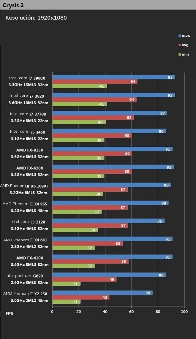 En esta tabla podemos observar como los intel vuelven liderar la tabla y podemos observar que los AMD fx se le acercan, mucho menos que en el battlefield 3, a los i7, pero también hay que tener en cuenta que battlefield 3 tiene mas fps que cualquier otro.